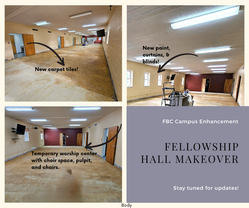 The fellowship hall renovation is scheduled to be completed within the next 6 weeks. Soon, we will start gathering in the fellowship hall for worship while the sanctuary is being updated.