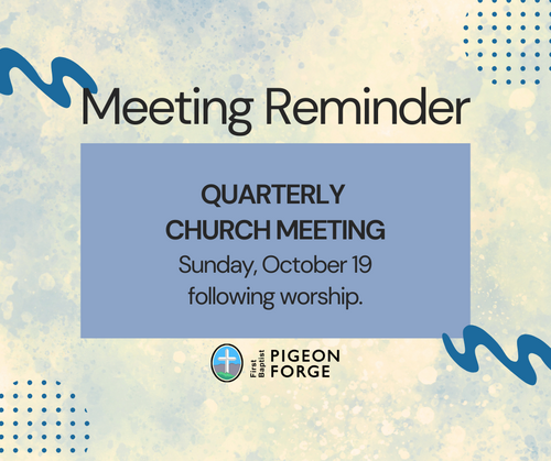 This Sunday, following worship, we will have a brief business meeting to discuss the 3rd quarter financial reports. We will also elect messengers to the Sevier County Baptist Association Annual Meetings (Oct 20-21) and the TN Baptist Convention Summit (Nov 9-12).