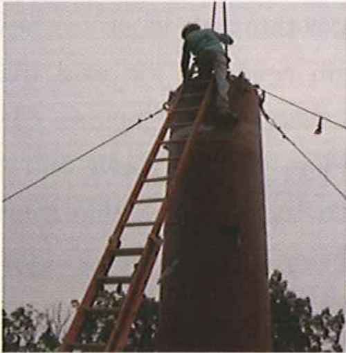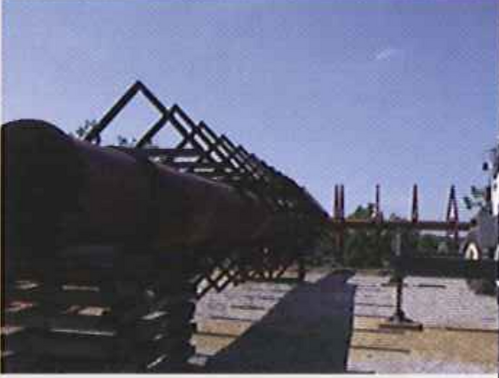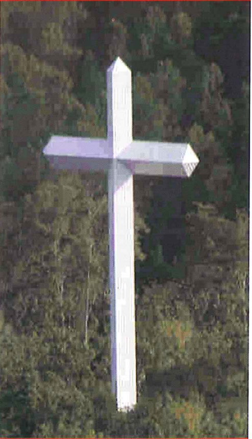 The cross measures 110' tall and 65' wide. The basic structure consists of steel pipes that have walls 1/2" thick. The bottom section is 48" in diameter and is set in a concrete foundation 10' square and 14' deep. The outer skin is aluminum with a baked enamel finish.